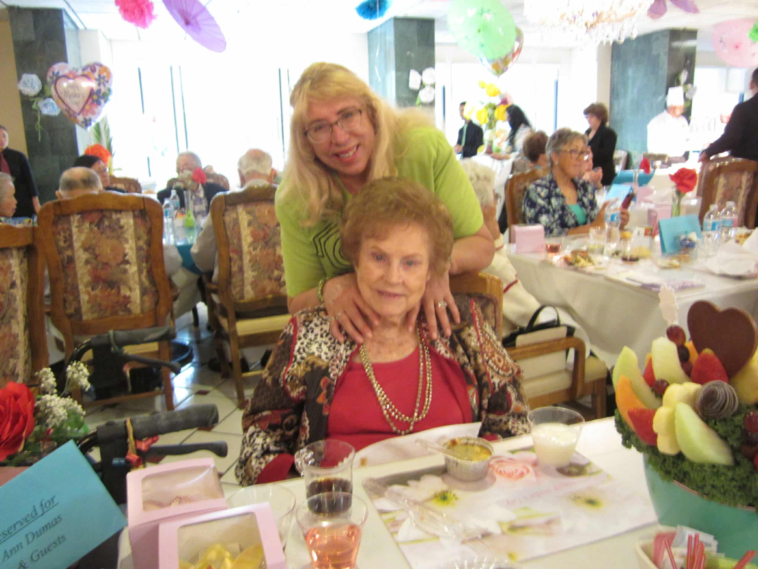 We found the perfect room at Arcadia Gardens that looked out to my Mom’s favorite Sierra Madre Mountains. We came as a package deal. My Mom got involved in all the activities and I started volunteering. She was very active and headed the exercise group for many years until she couldn’t do it any more. We started a bunco group and I realized that people couldn’t go from table to table so I invented round table bunco.